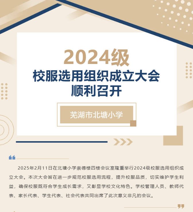 至此,北塘小学2024级校服选用组织成立大会圆满结束。此次大会的成功举办,标志着学校校服选用工作步入规范化、民主化、科学化的新阶段。相信在全体成员的共同努力下,一定能够为同学们挑选出安全、舒适、美观的校服,助力同学们健康快乐成长。